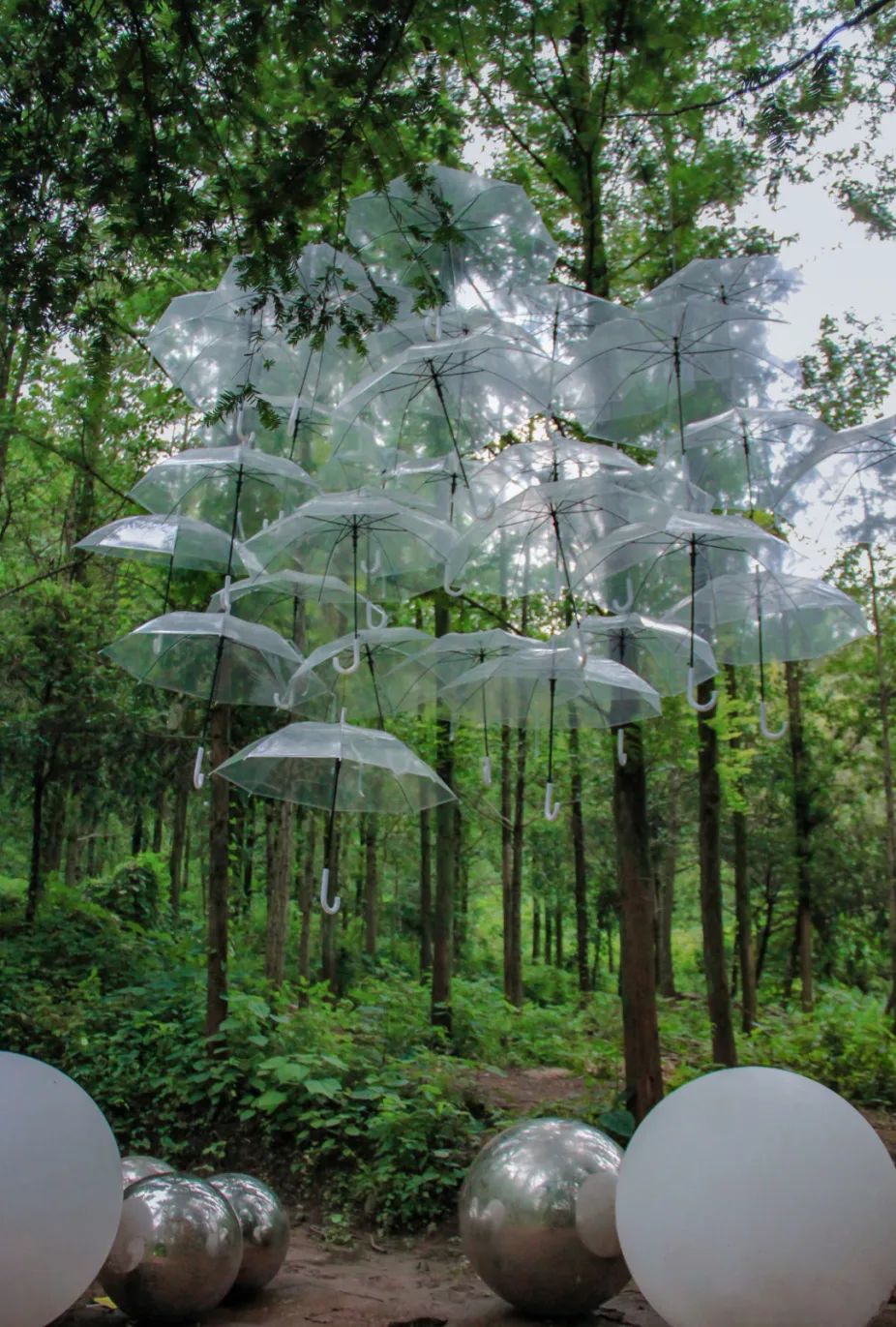 营地位于渝北翠云里创意园内紧邻轨道交通3号线翠云站步入营地恍如步入一个浪漫的“水雾世界”一条人工打造的小溪流蜿蜒而下高耸挺拔的水杉树一字排开折叠桌椅散落其中雅致木屋若隐若现薄似轻纱的雾气在林中缭绕升腾