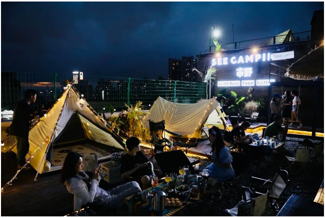 营地位于金紫山文创园6号库顶楼店内主打天台露营特色分为户外600平的露天热带雨林露营风与100平的工业风的室内场地帐篷天幕、沙滩石子营造出的真正野外场景在这里除了能与落日比肩还可看飞机划过天际穿入晚霞随手一拍都出大片