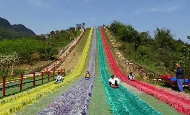 用4种不同的彩色以作区分根据体重选择适合滑道后乘坐一辆滑草车便紧抓车身体验快速滑下的惊险刺激