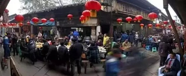 祈福活动、棋牌竞技赛之后沿青石板摆放的餐桌早已坐满食客新鲜宰杀好的猪肉被烹饪出各种菜品上千人一起同吃杀猪饭猪肉鲜嫩又肥美、蔬菜天然无污染边吃边聊、酒不醉人人自醉
