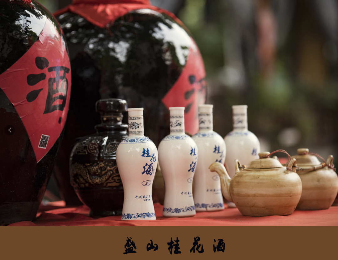 盛山桂花酒:酒色呈琥珀,鲜美透亮,酒性始终,味醇厚、微甜,上口带桂花香,桂花酒四季皆可品饮,它滑过饮者的口舌,激荡着心灵深处的快乐分子。若干时辰过后,雅集散去,但醇厚清远的桂花酒香却长久不散。
