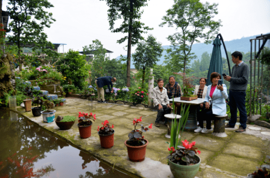 不仅如此,村民自发废物利用,将废弃的轮胎、水缸水槽、坛子组合成一个个精致的盆景,美不胜收。