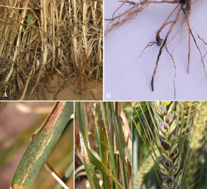 【症状识别】:主要危害茎基部叶鞘,初期出现淡褐色水渍状小斑,后扩展为椭圆形或梭形病斑,边缘褐色、中间灰白色,后期病斑环绕茎秆,导致麦苗发黄、生长迟缓,严重时根系腐烂、幼苗枯死。