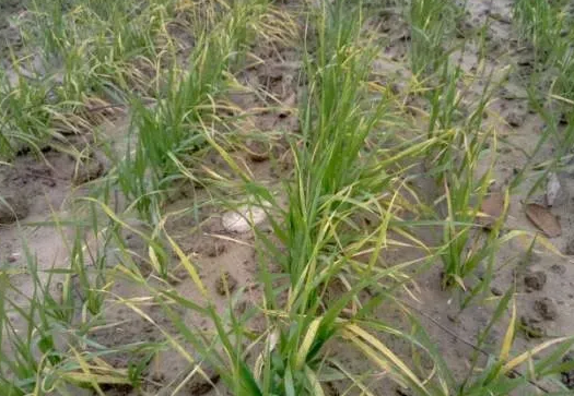 播种量过大导致麦苗拥挤,相互争肥、争水、争光,出现“假性旺长”,不仅群体过大、冬前易拔节受冻,还会降低分蘖质量、增加无效分蘖,甚至引发倒伏。 对策:对麦田局部麦苗稠密区域,及时进行人工疏苗,优化群体结构。 四、土壤盐碱偏重致黄苗