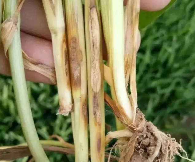 再就是拔下几棵小麦来看看根系,健康的小麦一般都可以连根拔起,如果一拔就断了,那基本就是根部病害影响的,如果拔下来小麦茎基部发黑发臭,呈现酱油根,那就是茎基腐病,如果茎基部有云纹状的病斑那就是纹枯病,如果根系非常少,颜色也不正常,还没有新生根的出现,那就是根腐病。这些都会导致小麦叶片发黄,后期出现枯白穗。