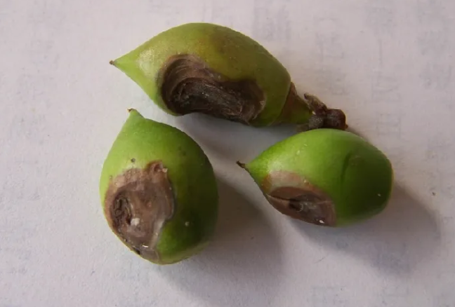 花器受害腐烂,表面丛生灰霉, 最后干枯。嫩叶受害子叶缘开始,最后全叶枯萎,传染枝条,形成溃疡斑,常有流胶现象。按照细菌性病害去防治,湿度大时易发生。