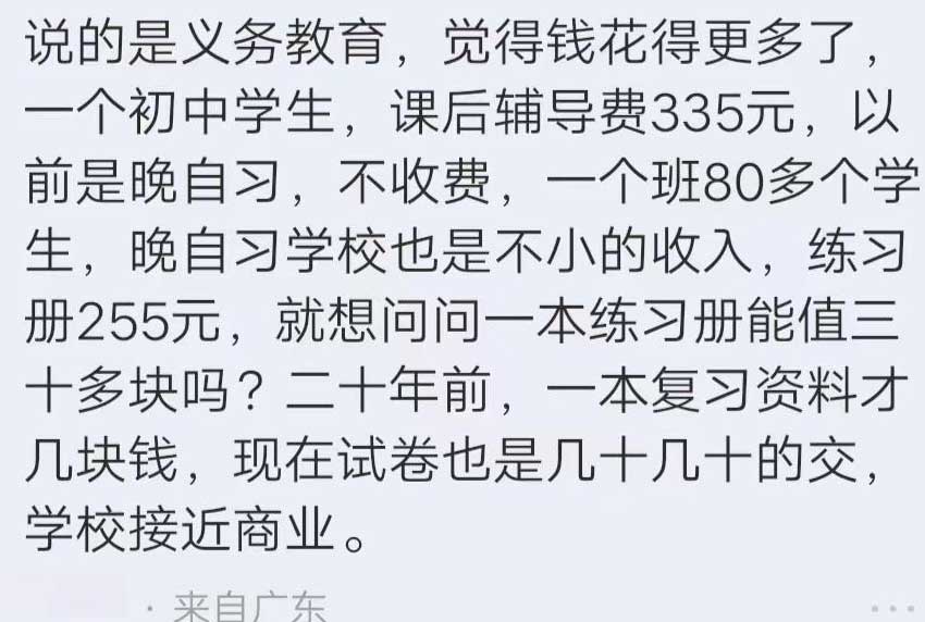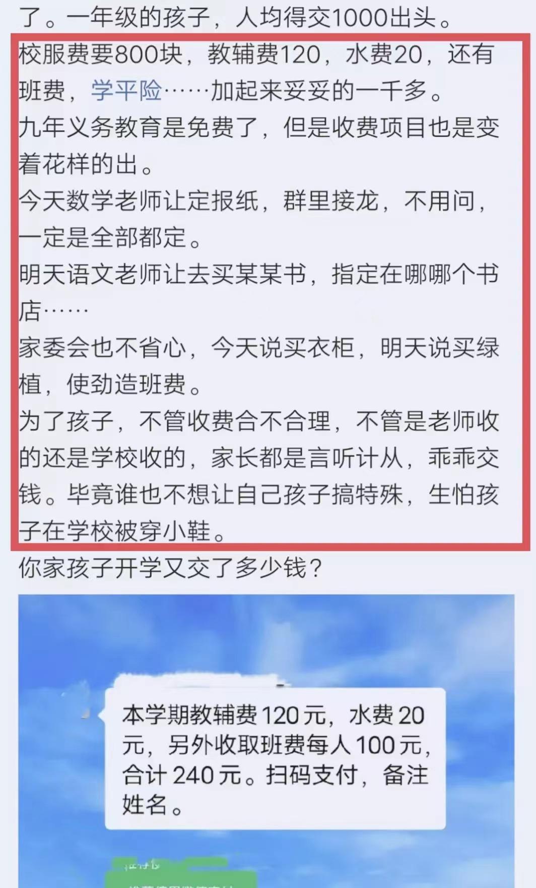 一位江苏的家长发文吐槽:称九年义务教育是免费了,但是收费项目也花样百出,一年级的孩子,人均就得交1000多元,校服费800元,班费100元,水费20元,教辅费120元,加起来不是一笔小数目。