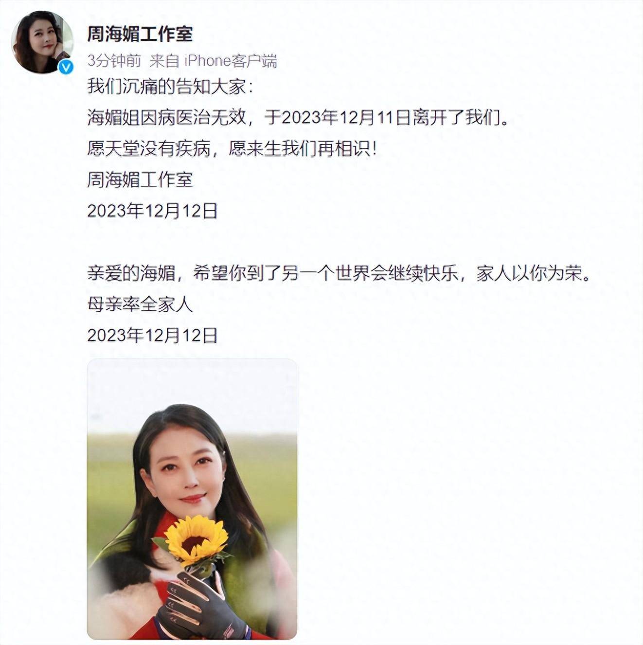 12月12日晚,周海媚工作室对外发布讣告,悲痛宣布周海媚因病去世,将生命停留在57岁,如此年轻就匆匆离世,留给亲友、粉丝无尽哀痛,愿她一路走好。