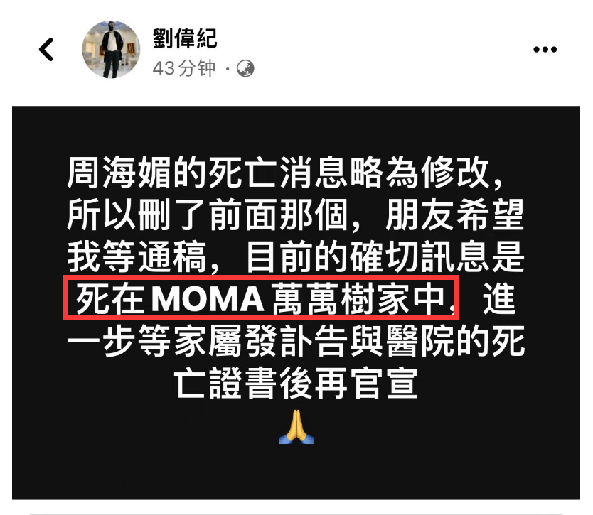 另外,好友还透露周海媚去世的准确地点是在MOMA万万树家中,这也是周海媚在北京的住址,这位好友又一次强调说家人没有发声也是在等待医院的死亡证明,确定真正的死因后再对外发布。