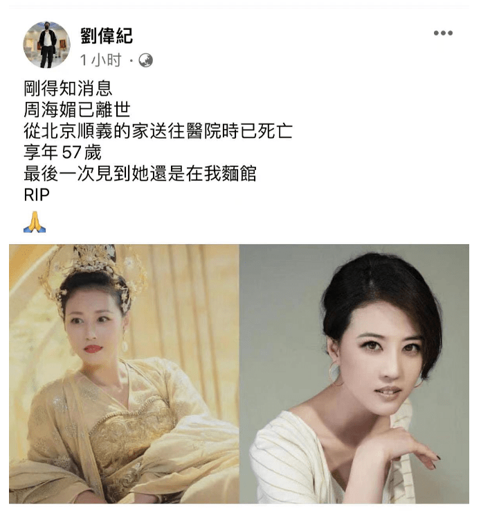 另外,周海媚的圈外好友在昨天就爆料了,说周海媚确实走了,是在顺义的家送往医院时就走了,两人最后一次见面是在他面馆中。