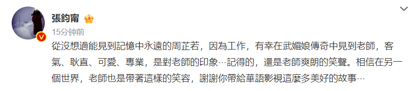 得知周海媚去世的噩耗后,陈法蓉、张钧甯、尹正纷纷发文悼念,张钧甯怀念和周海媚老师一起拍戏的点滴,感谢她带来这么多美好的故事。