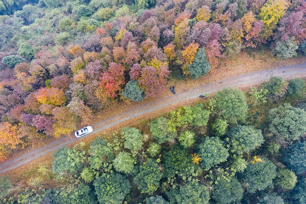 西山垭口往白云山方向约2公里处枫叶渐次变了颜色呈现出五彩斑斓层林尽染的冬日美景