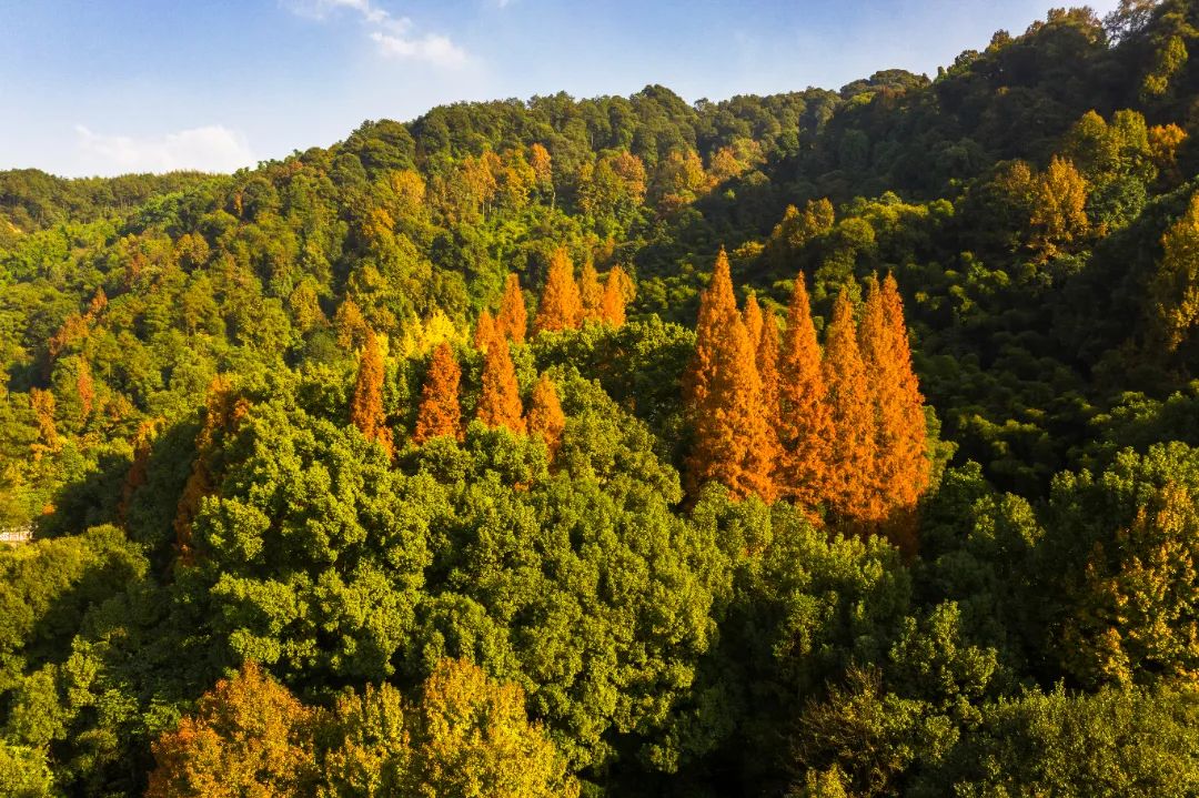 黄色的水杉红色的枫叶与绿树相映成趣