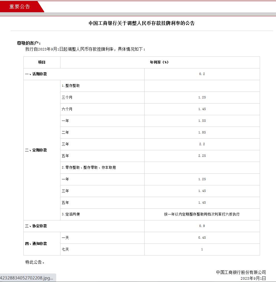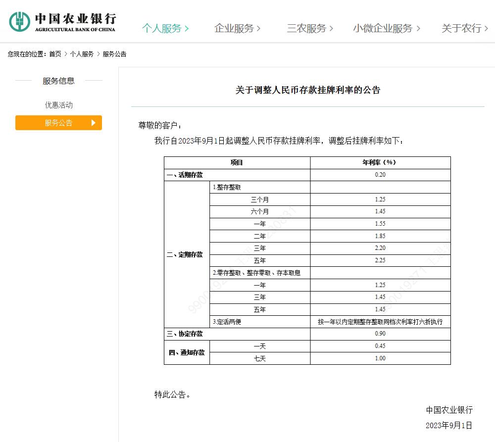 据央视财经消息,9月1日,国有六大银行,即中国工商银行、中国农业银行、中国银行、中国建设银行、中国邮政储蓄银行、交通银行,均已在官网更新了人民币存款参考利率表,将中、长期定期存款挂牌利率进行下调。