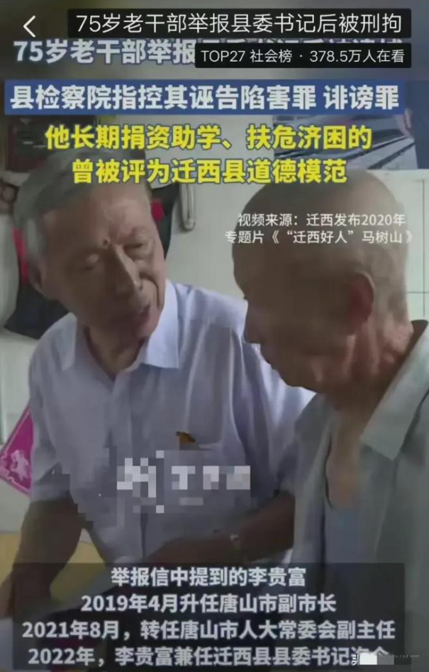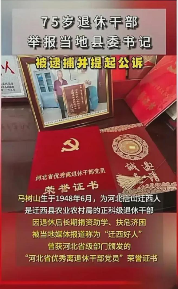 河北唐山迁西县退休干部马树山举报现任县委书记李贵福后,被以诬告罪、诽谤罪两项罪名依法逮捕,并被当地检察机关向法院提起公诉!
