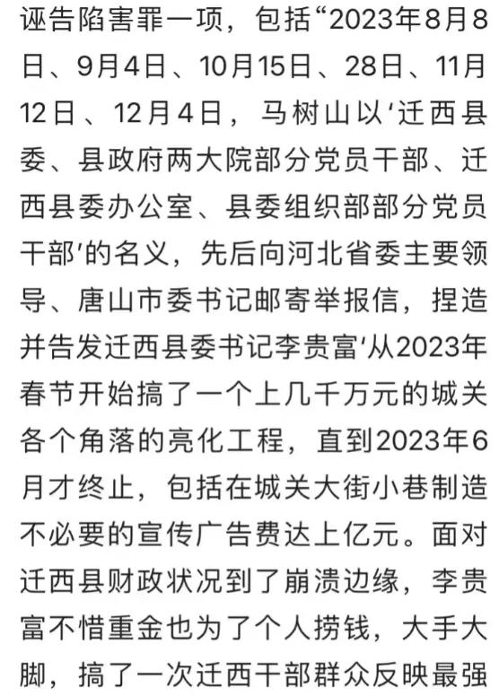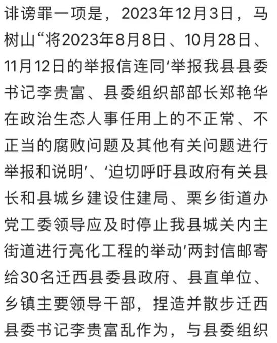 但如果马树山举报失实,那对马树山来说,影响可能也是巨大,毕竟诬陷、诽谤当地的县委书记这罪名可不算小。就像迁西县委办公室所说的,这些举报信“严重破坏了迁西县的政治生态和社会大局稳定”。
