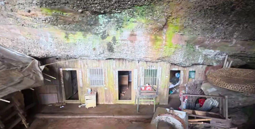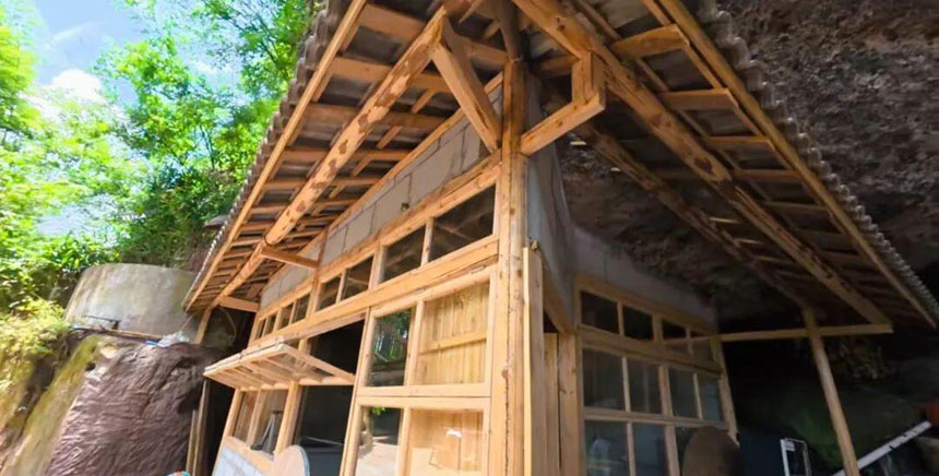 走近了才发现,屋子里有很多能让人先愣住的细节。第一间是夯土房,墙里隐约有最早的房梁,狭小的居室高度不到两米,冬暖夏凉,是几代人的智慧。崖壁上嵌着小鹅卵石和贝壳,屋主说这里曾经是海,那些纹理是亿万年前的记忆。屋檐用茅草盖着,雨天可能会有水滴声,屋前有石缸和水槽,喝的就是山泉水。主人把一间新建的木屋当厨房,门前搭了个平台,摆上麻将桌,客人可以坐着抽风、打牌,像是一种生活的仪式。这里对外开放做农家乐,电视台也来过,好像慢生活和小红利同时在这个山壁上并存。