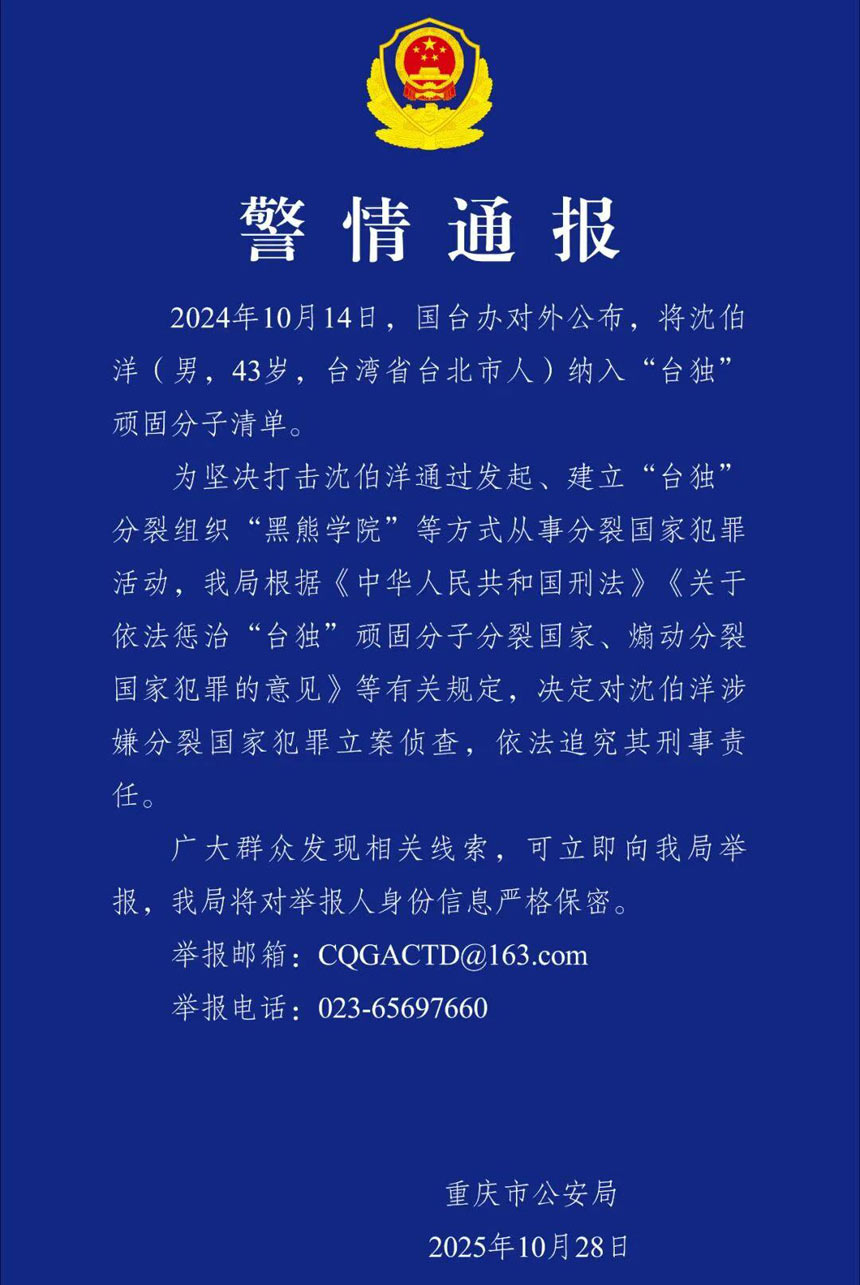 重庆市公安局28日发布警情通报表示,为坚决打击沈伯洋通过发起、建立“台独”分裂组织“黑熊学院”等方式从事分裂国家犯罪活动,该局根据《中华人民共和国刑法》《关于依法惩治“台独”顽固分子分裂国家、煽动分裂国家犯罪的意见》等有关规定,决定对沈伯洋涉嫌分裂国家犯罪立案侦查,依法追究其刑事责任。