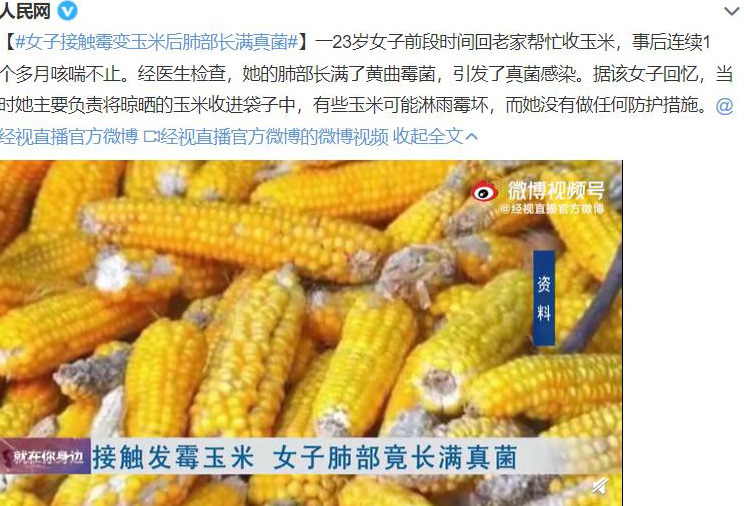 经医生检查,她的肺部长满了黄曲霉菌,引发了真菌感染。据该女子回忆,当时她主要负责将晾晒的玉米收进袋子中,有些玉米可能淋雨霉坏,而她没有做任何防护措施。
