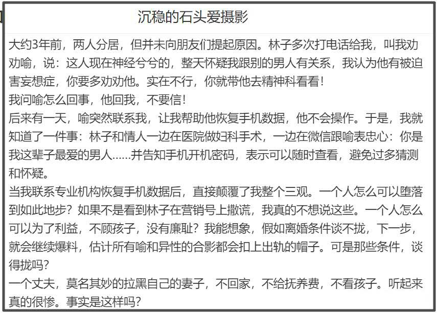 自称喻恩泰和史林子共同好友“沉默的石头爱摄影”(以下简称“石头”)为喻恩泰发声,怒斥史林子“是个疯子”,并晒出疑似多年来史林子出轨他人的聊天记录。