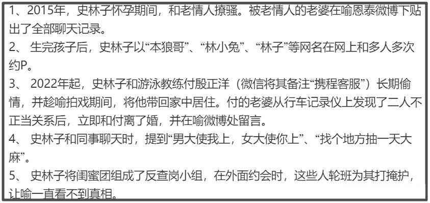 除此之外,史林子还被指出轨游泳教练,也就是有妇之夫付某,被其老婆发现,还在喻恩泰评论区留言曝光。