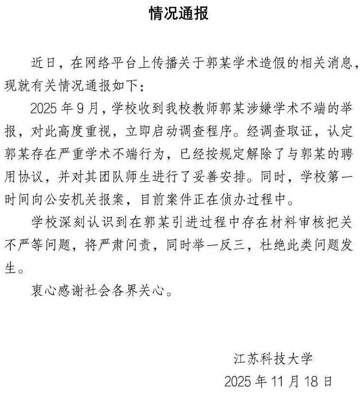 11月18日,江苏科技大学官方微博发布情况通报。通报称,今年9月,学校收到我校教师郭某涉嫌学术不端的举报,对此高度重视,立即启动调查程序。经调查取证,认定郭某存在严重学术不端行为,已按规定解除了与郭某的聘用协议,并对其团队师生进行了妥善安排。同时,学校第一时间向公安机关报案,目前案件正在侦办过程中。学校深刻认识到在郭某引进过程中存在材料审核把关不严等问题,将严肃问责,同时举一反三,杜绝此类问题发生。