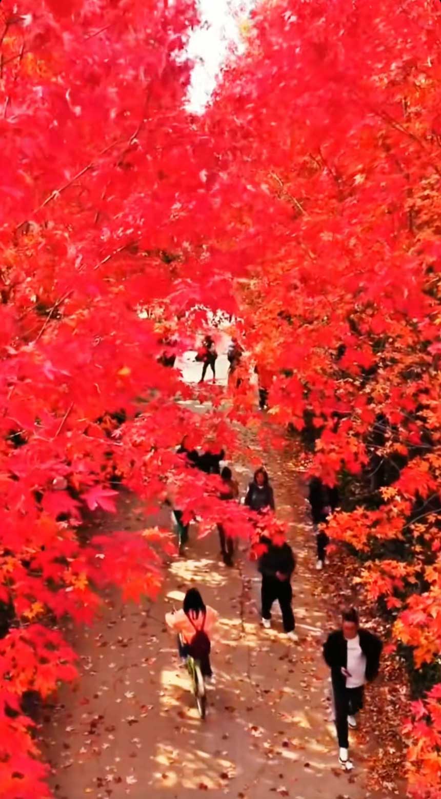 先说这红枫林到底多绝。千亩红枫像被上帝打翻的调色盘,红得热烈又纯粹。走在林间,脚下是厚厚的枫叶,踩上去沙沙响,仿佛踩进了秋天的怀抱。穿件汉服往枫林中一站,随手一拍都是古风大片;航拍视角下,千亩红枫连绵成片,壮观到让你忍不住感叹大自然的神奇。