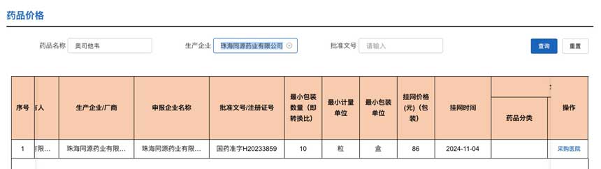 珠海同源药业有限公司的磷酸奥司他韦胶囊目前挂网价格86元