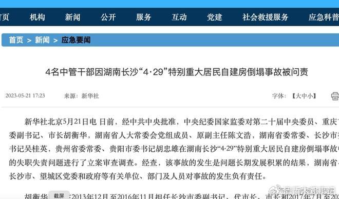 值得注意的是,这并非胡衡华首次受到纪律问责。2023年5月,中央纪委国家监委曾对其在湖南长沙“4·29”特别重大居民自建房倒塌事故中的失职失责问题立案审查调查,认定其对事故发生负有领导责任,给予党内警告处分。此次被查,再次印证了“全面从严治党永远在路上”的深刻内涵——无论职务多高、资历多深,只要触碰党纪国法红线,必将受到严肃惩处。