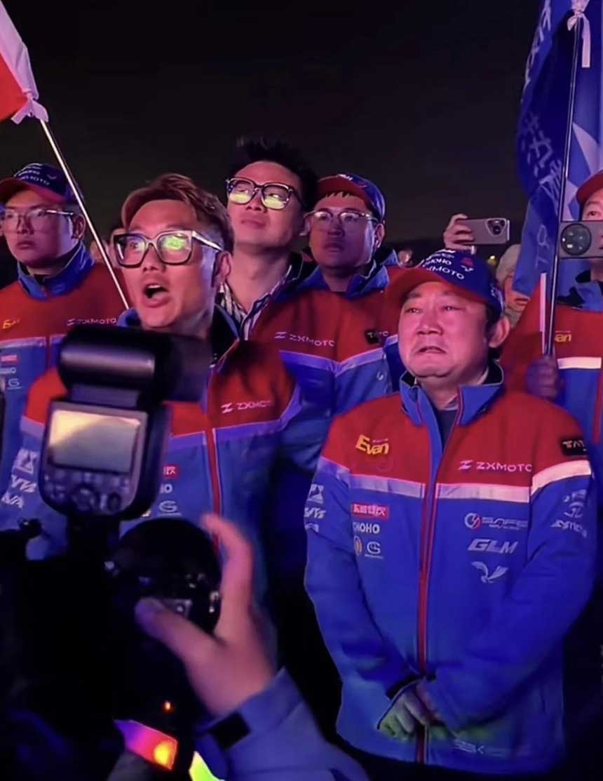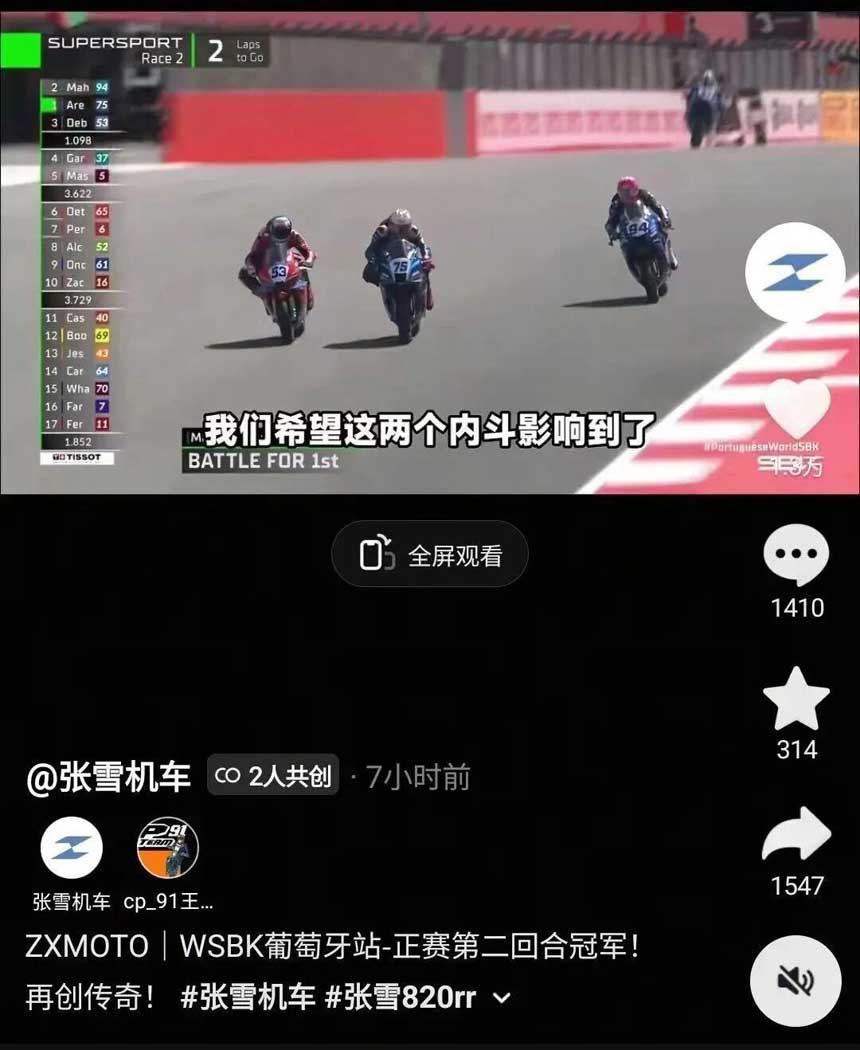 法国车手驾驶张雪机车的820RR-RS赛车获得WSBK葡萄牙站冠军,赛后高举五星红旗。据张雪机车