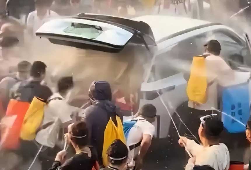 如果说这两名女子的遭遇是个案,那随后发生的“拉车门”事件则暴露了这种恶意的蔓延。 4月14日,也就是事发后的第二天,一辆正常行驶的电动汽车被路人强行拉开车门和后备箱,一群人对着车内猛喷水。由于水直接喷进了电路系统,导致车内部当场冒烟。
