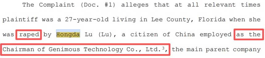 起诉状显示,原告为一名27岁女性,居住在佛罗里达州,控诉被中国公民Hongda Lu强奸(raped)。Hongda Lu系 Genimous Technology Co., Ltd.董事长,后者为三名被告的母公司。