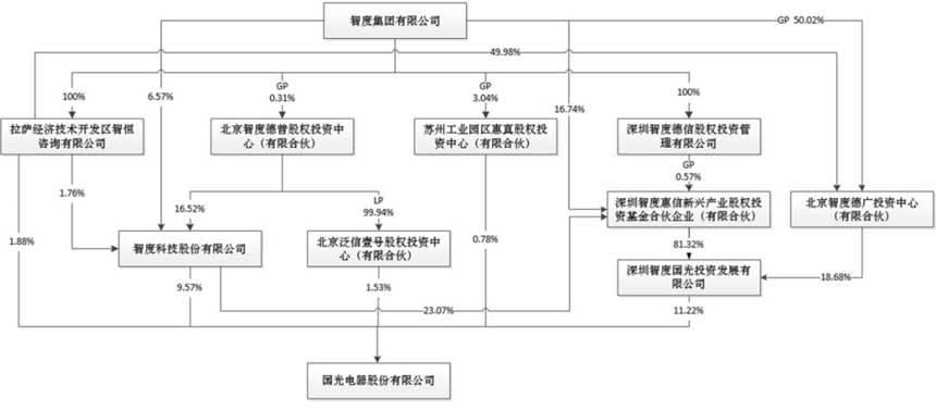 智度惠信与智度德广分别持有深圳智度国光投资发展有限公司(下称“智度国光”)81.32%、18.68%股份,智度国光直接持有国光电器(002045)11.22%股份,为国光电器(002045)第一大股东。