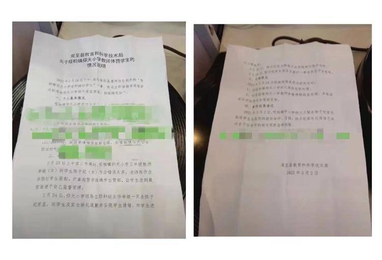 从刘女士在社交平台发布的视频中记者看到,小女孩两侧脸颊均有不同程度的淤青,此外刘女士还放出了一份周至县教育和科学技术局关于哑柏镇仰天小学教室体罚学生的情况说明。从这份情况说明中,记者了解到,2月23日上午第二节课时,仰天小学三年级教师李某(女)因学生陈某某(女)作业错误太多,老师用作业本抽打学生脸部,并拿起凳子推搡学生背部,让学生坐到最前面便于自己监督管理。