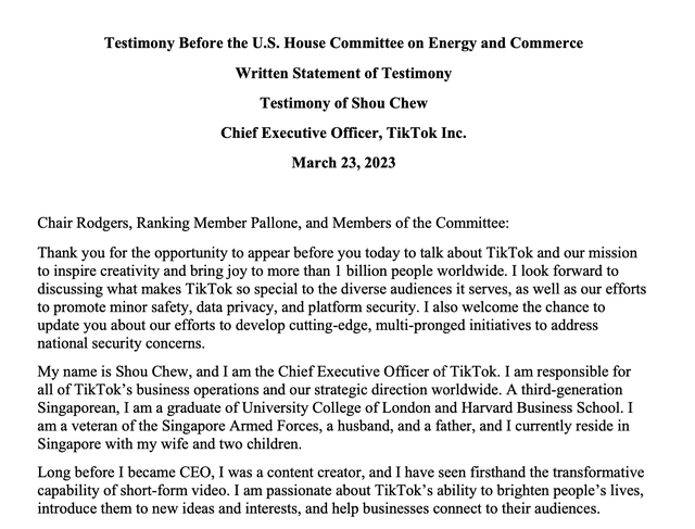 第一财经记者获得的周受资在美国众议院能源和商业委员会作证的书面证词显示,周受资先介绍了自己的职务与籍贯,作为TikTok CEO,周受资负责其在全球范围的所有业务运营与战略方向。