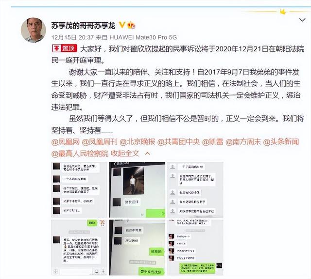 信息显示,苏享茂和前妻在世纪佳缘上相识。两人婚姻关系存续期间,苏翔茂为女方购买了一套海南清水湾住房、一辆特斯拉电动车,汇款多次,累计花费近1300万元。翟欣欣曾威胁苏享茂做公安叔叔。9月12日晚,叔叔发表声明,表示对此一无所知,与之交往稀疏。翟欣欣本人没有做出任何回应和表示。哥哥苏亨龙一直在为弟弟讨回公道,但证据不足,刑事诉讼尚未立案,但民事诉讼于2020年12月在朝阳法院审理。