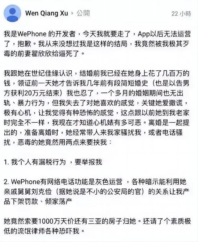 2023年6月9日,苏享茂的哥哥苏享龙在社交媒体上透露,翟欣欣涉嫌敲诈勒索已被北京海淀区公安局立案侦查,并被逮捕羁押在看守所。翟欣欣因敲诈勒索罪被北京海淀公安拘留。刚听到翟欣欣的名字,很多人可能不知道事情的起源,毕竟,六年后,2017年3月30日通过婚姻网站认识苏翔茂,6月7日获得许可证,7月18日离婚。9月7日凌晨,WePhone创始人苏享茂从屋顶跳下楼身亡。短短109天,苏享茂与翟欣欣相识、领证、离婚。