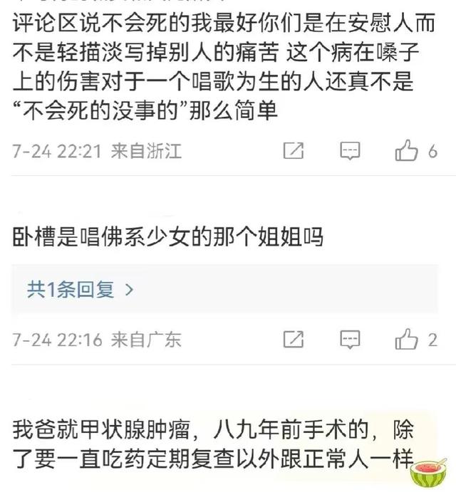 网友们看后纷纷评论道:能手术就不是晚期吧?天呐,希望健健康康。甲状腺癌99%死不了人,不需要矫情。过来人留言。这是个什么病?晚期还可以恢复吗?我的天,我手机之前的铃声还是她唱的小宇。