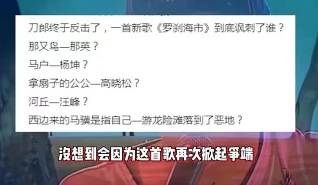 这些言论以及行为使得刀郎被迫退出了乐坛。然而,十几年过去了,刀郎带着他的新歌《罗刹海市》回到了音乐界,他的歌词每一句都深深地刺痛了人们的心。有网友分析,刀郎在这首新歌中暗讽了那英,杨坤,汪峰,高晓松等四位乐坛的大人物。
