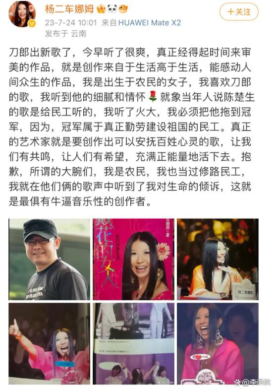 近日,久违露面的杨二车娜姆突然在社交平台上为刀郎喊话,并表达了自己对刀郎的欣赏之情。